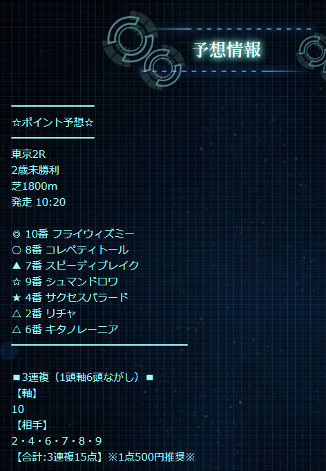 提供は重賞のみで敏腕馬券師チームと情報筋からの情報を公開しているそうです。