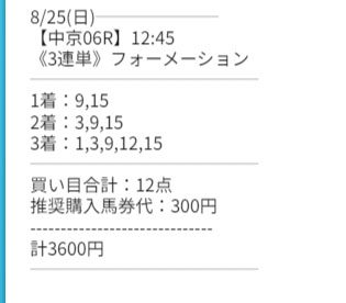 まずは8月24日 (土)に公開されていた買い目がこちらになります。
