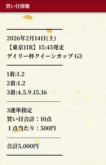 俺が口コミ1番乗り!先週の無料予想で万馬券的中&1点500円の馬券代で5万1750円ゲット! こういう的中が地味に嬉しいんだよな! コンスタントに無料予想当たってるな、今回もありがとうです!