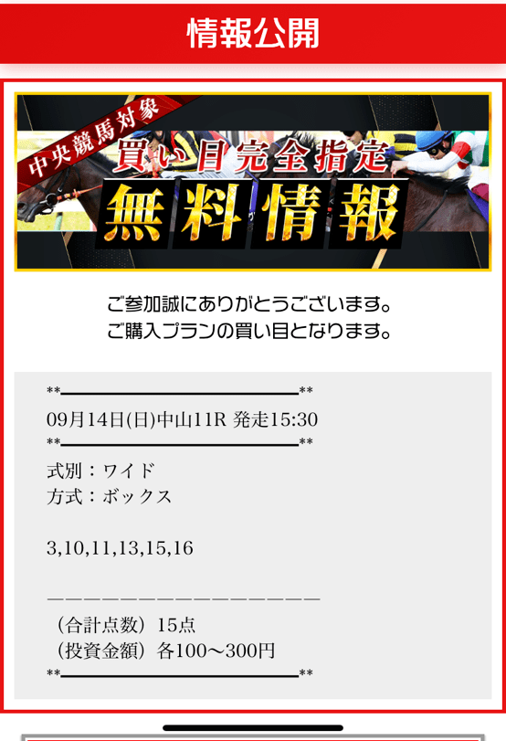 先週はローズステークスの裏開催中山メインラジオ日本賞を無料予想で獲らせてもらいました。 無料情報だからワイドだったけど、稀にない1~4人気が馬券外という3連単100万馬券決着の5人気→6人気をぶち抜いて当たり! 払い戻しは35,700円だったけど買い方次第で10万、20万もいけたかもしれない!